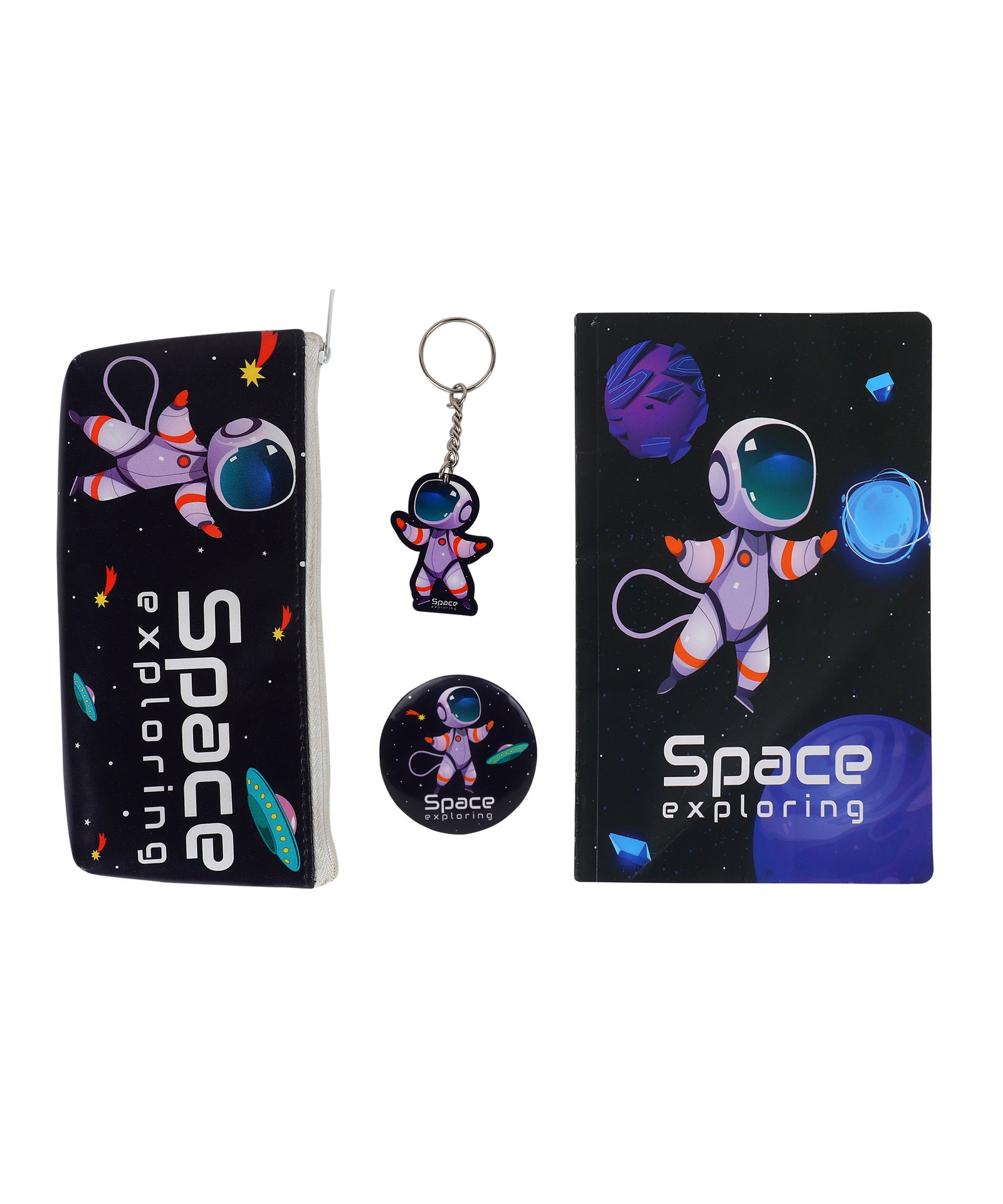 | Space Stationery Set for Kids includes matching 1 A5 Notebook, 1 KEYCHAIN, 1 BADGE AND 1 PENCIL POUCH. Notebook includes 100 ruled pages. Ideal gift for kids for any occasion birthday return gift or on any occasion. |